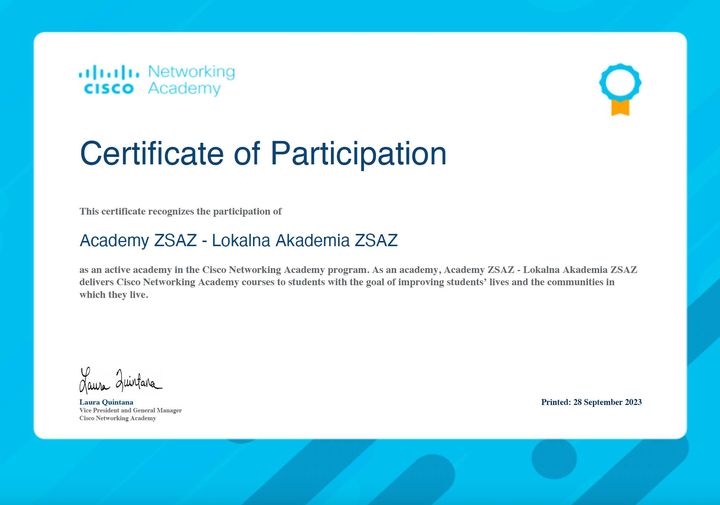 Nasza szkoła otrzymała Certyfikat potwierdzający udziałAcademy ZSAZ - Lokalna Akademia Zespół Szkół Aktywności Zawodowej - ZSAZjako aktywnej akademii w programie Cisco Networking Academy.